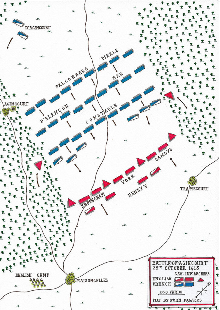 – Terrain: narrow ploughed field between Tramecourt and Agincourt woods; rain preceding the battle turned soil to deep mud.