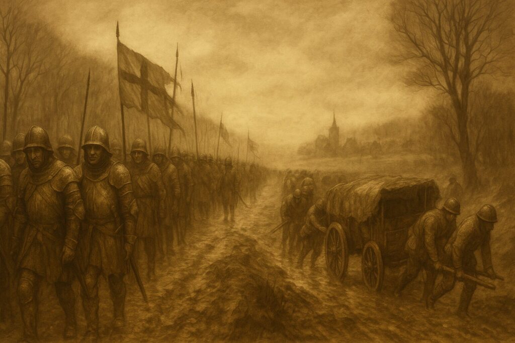 The siege had broken us more than it had the French. When we left Harfleur, the ground behind still smoked from the fires of surrender. Half of Henry’s army remained behind, sick or dead. The rest marched north, a column of ghosts dragging itself through rain and mud toward Calais. I felt the familiar heaviness of Providence pressing on me—the quiet recognition that the lesson had not yet been learned.
